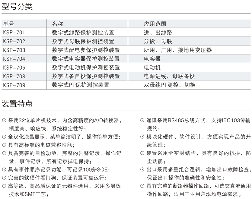 KSP-700系列數字式保護測控裝置是我公司為適應我國工業電氣自動化發展的需要,積累多年電力自動化運行經驗,吸收國外先進技術,向廣大用戶推出的集保護、測量、控制、通訊于一體的高性能數字式保護測控裝置,廣泛適用于35kV及以下電壓等級變電站、開關站及廠用電的新建和改造工程。為其配電系統的保護與控制提供完整的解決方案。裝置可以集中組屏安裝,也可以分散在開關柜就地安裝。